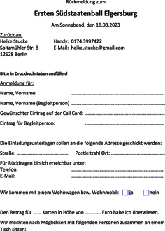 Um dem Ballambiente gerecht zu werden, begrenzen wir die Gästeanzahl. Die Reihenfolge der Anmeldung entscheidet über die Teilnahme. Zur Anmeldung gehört die „Rückmeldung zum Ball“, die „Einwilligungserklärung“ und der Zahlungseingang. Die Anmeldefrist endet am 26.02.2023. Nach Ende der Anmeldefrist werden die persönlichen Einladungskarten und die Call Card versendet.