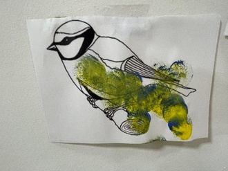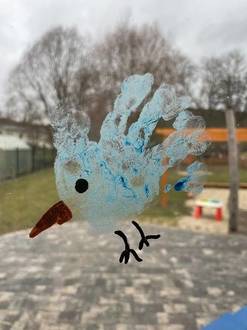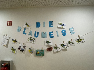 Wir beobachten die Vögel durch unser großes und bodentiefes Fenster. Außerdem bekommen wir neue Mitbewohner und Familie Blaumeise zieht bei uns ein, ein blauer Handabdruck der Kinder wird dazu zu einer Blaumeise verwandelt.