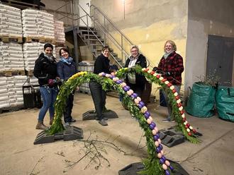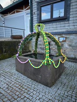 Doch nicht nur das Ei wurde gestaltet. Am Donnerstag, den 07. März 2024 wurde auf dem Bauhof der Schmuck für den Osterbrunnen vorbereitet, welcher dann am Freitag, den 08. März 2024 aufgebaut wurde. Nachdem der Osterbrunnen fertig geschmückt war, widmeten sich die Kirmesdamen der Ortsgestaltung indem Sie mehrere hundert Eier in Kettenform bzw. einzeln verteilten. Jede Kirmesdame erhielt von mir als kleines Dankeschön und Frauentagsgruß eine Rose.