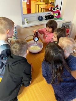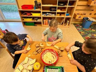Gespannt fieberten sie dem praktischen Teil entgegen. Die Vorschüler haben eine Joghurt-Bombe und Quarkbrötchen zubereitet. Die Eichhörnchen haben neben einem Frischkäse-Orangen und Hagelschlag Aufstrich ein Zitronen-Minzwasser vorbereitet. Außerdem wurden von ihnen am Vortag bereits zwei Brote gebacken. Die Füchse belegten mit Hingabe eine Apfelpizza und stellten einen Frischkäse-Honig Aufstrich sowie Quark her.