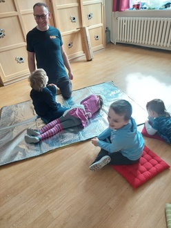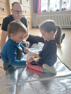 Ein Mitarbeiter des Arbeiter-Samariter-Bundes zeigte den Kindern zudem, wie man ein Pflaster und einen Verband sauber und richtig anlegt. Auch die stabile Seitenlage wurde genau gezeigt. Beim gegenseitigen Üben mit einem Partner konnten die Vorschüler das Wissen sofort praktisch anwenden.