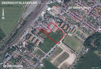 Übersichtslageplan mit Geltungsbereich (rot umrandet) des vorhabenbezogenen Bebauungsplans für das Sondergebiet „Nahversorgungszentrum Gerstungen“ der Gemeinde Gerstungen (Kartengrundlage: Übersicht DTK; Quelle: GDI-Th ohne Maßstab)