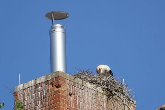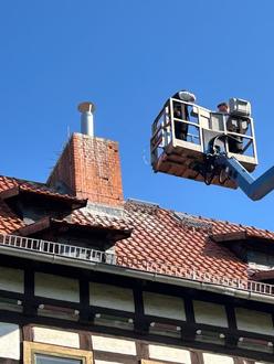 Um sicherzustellen, dass weder am Schornstein noch an der Heizungsanlage Einschränkungen auftreten, wurde eine Rohrverlängerung angebracht. Diese Maßnahme dient nicht nur dem Schutz des Schlossgebäudes, sondern kommt auch unseren Adebars zugute. Später wird auch noch eine zusätzliche Abdeckung am Schornstein selbst angebracht, um den Störchen einen sicheren Platz zum Brüten zu bieten.