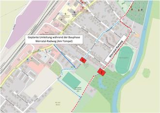 Es ist beabsichtigt und wie im Plan dargestellt, für die Zeit der Sperrung des Werratal-Radwegs (Am Tümpel) eine Umleitung über die Straße Im Feld, weiterführend in die Rosengasse einzurichten.