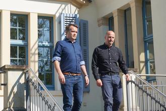 RTL-Nachrichtenmacher Christopher Wittich und Bürgermeister Daniel Steffan vor dem Rathaus Gerstungen