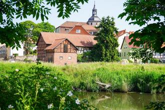 Ein frühsommerlicher Blick vom Gelände der Freiwilligen Feuerwehr Gerstungen über die Werra zur Katharinenkirche mit dem historischen Ortskern.