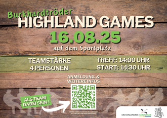Im Zuge unseres "Großen Fest im Spatzennest" vom 15.-17.08.2025 veranstalten wir am 16.08.2025 auf dem Sportplatz in Burkhardtroda unsere ersten Burkhardtröder Highland Games. Seid mit eurem Team dabei und messt euch in unterschiedlichsten Disziplinen. Bei uns kann jeder glänzen. Jetzt ganz einfach online anmelden.