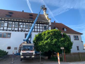 Bereits am Morgen konnten wir ein aufregendes Ereignis beobachten. Ein großes Fahrzeug stand vor unserem Schloss mit einem langen Ausleger-Arm, der bis zum Storchennest hochfahren konnte.