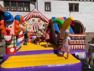 Das Highlight des Tages war die schöne bunte Hüpfburg. Beim Springen, Rutschen und Toben kam so mancher ins Schwitzen. Zum Glück konnten wir uns dann mit einem leckeren Eis abkühlen.