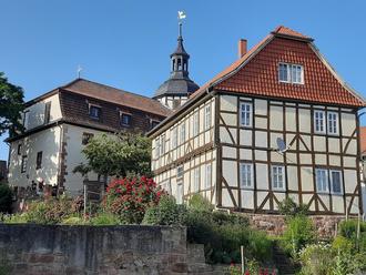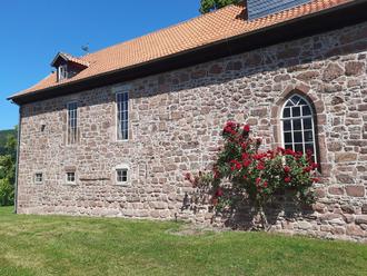 Auch die Marienkirche in Sallmannshausen mit der wunderbar blühenden Rose auf der Südseite lädt zum Kirchgang ein.