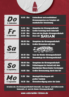 Die Kirmesgesellschaft Untersuhl und der Jugend- und Kulturverein Untersuhl e. V. laden ein. Kommt nach Untersuhl und feiert wieder mit uns gemeinsam die 31. Untersuhler Kirmes, Start ist Donnerstag, dem 05.09.2024 um 18.00 Uhr Am Festplatz „Am Ritter“.