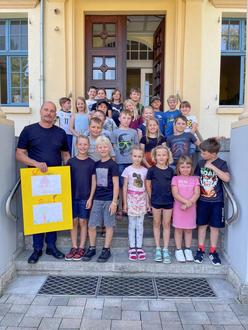 All diesen Fragen konnten Bürgermeister Daniel Steffan und Hauptamtsleiter Mathias Richter Rede und Antwort stehen. Als Dank erhielten die beiden ein von den Kindern selbst gestaltetes Plakat, das nun in den Räumlichkeiten des Rathauses einen Platz findet. Auch jedes der Kinder bekam einen kleinen grünen Rucksack mit dem Logo der Gemeinde - Storch - mit auf den Weg.