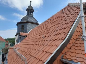 Die Aufräumarbeiten werden durchgeführt. Die Schieferarbeiten wurden abgeschlossen. Die Firstziegel wurden althergebracht in einem Mörtelbett verlegt, eine sehr anspruchsvolle Arbeit, die heute fast nur noch an denkmalgeschützten Gebäuden zur Ausführung kommt. Der Einbau der Fenster Dachgaupen erfolgt wegen Lieferschwierigkeiten zu einem späteren Zeitpunkt. Das Gerüst wird zurückgebaut.