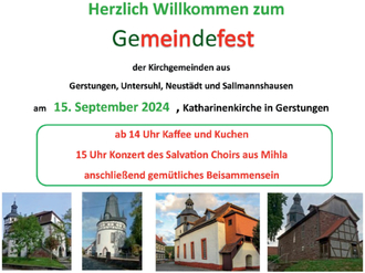 | 15:00 Uhr | Katharinenkirche Gerstungen: Konzert mit dem Gospelchor salvation Mihla zum Gemeindefest unserer Kirchengemeinden |