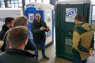 Weiter führte der Rundgang durch die Produktionshallen im Unterfeld zur TOI TOI & DIXI Group Entwicklungsabteilung. Hier sorgen Chemiker wie Dr. Tim Woriescheck dafür, dass die Hygiene immer weiterentwickelt und verbessert wird. So wird nun im Fertigungsprozess für Toilettenkabinen dem Kunststoffgranulat ein Silberphosphat beigefügt. Durch die Wirkung der Silber-Ionen werden nahezu alle Keime an der Oberfläche dauerhaft unschädlich gemacht. Zudem entwickelten Fachleute in eigenen Versuchslaboren ein Duftstoff-Rezept, sodass es in den Toiletenkabinen angenehm zitronig duftet.