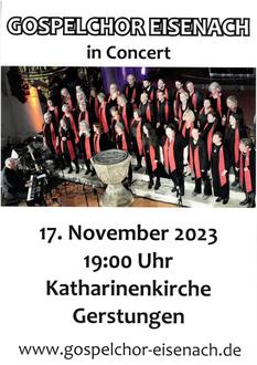 | 19.00 Uhr | Katharinenkirche Gerstungen: Konzert für Groß und Klein mit dem Gospelchor Eisenach, Leitung: Thomas Wagler (Eintritt frei, um eine Spende für die Unkosten und den Erhalt der Kirche wird gebeten!) |