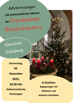 | 18:30 Uhr | Katharinenkirche Gerstungen: „Adventssingen“ mit weihnachtlichen Weisen des Eisenbahnerblasorchester Gerstungen, anschl. Begegnungen mit Glühwein und weiteren Getränken vor der Kirche |