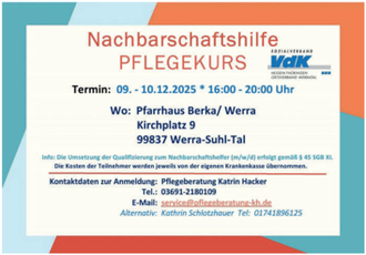 Für die Nachbarschaftshilfe in Thüringen benötigt man einen Kurs. Der 2. Pflegekurs wird mit unserer Unterstützung durch die Pflegeberaterin Katrin Hacker in Werra- Suhl-Tal angeboten. Dieser dient der Unterstützung von Pflegebedürftigen und ihren Angehörigen und soll ihnen dabei helfen, die Anforderungen, die sich aus der Pflegesituation im Alltag ergeben, besser zu bewältigen. Sie richtet sich an Menschen aus dem unmittelbaren, persönlichen Umfeld - also Nachbarn, Bekannte oder Freunde - und wird freiwillig und nicht erwerbsmäßig erbracht.