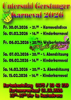 Karten können ab sofort per WhatsApp oder SMS unter 0175-3342239 bestellt werden. Der Kartenpreis für die Abendveranstaltungen bleibt stabil bei 12,00€.