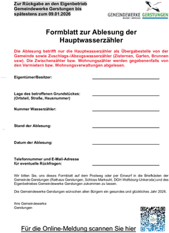 Aus verwaltungstechnischen Gründen können telefonisch keine Zählerstände entgegengenommen werden! Wir weisen darauf hin, dass nur Wasserzählerstände in der Abrechnung berücksichtigt werden, die uns bis zum 09.01.2026 vorliegen. Ansonsten wird der Wasserverbrauch für 2025 geschätzt.