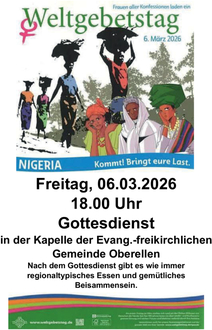 | 18.00 Uhr | Ökumenischer Gottesdienst zum Weltgebetstag Kapelle der Evang.-freikl. Gemeinde Oberellen Thema: Nigeria |