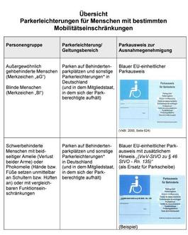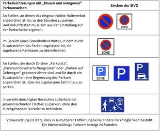 Mit diesem Berechtigungsausweis ist ein Parken auf einem Behindertenparkplatz gesetzlich zwar nicht zulässig, allerdings gelten u. a. folgende Parkerleichterungsmöglichkeiten: