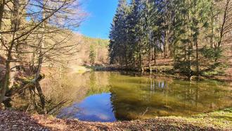 Frühling im Bohngartental: Der Teich bei Marksuhl zeigt sich hier vor einigen Tagen von seiner schönsten Seite und lädt zu erholsamen Spaziergängen in der erwachenden Natur ein.