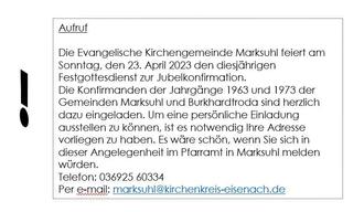 Mittwoch, den 29. März 2023 treffen sich die Mädchen und Jungen der Konfirmandengruppe Klasse 8 um 14 Uhr zum Unterricht im Gemeindehaus Marksuhl
