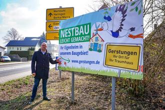 Die Banner setzen mit einem Storch, dem Wappenvogel Gerstungens, auf eine witzige und symbolische Werbeidee für den „Nestbau“, die so zu unserer Gemeinde passt!