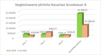 Auf der Grundlage der von den Grundstückseigentümern eingereichten Steuererklärungen wurden vom Finanzamt für alle Grundstücke neue Grundsteuerwerte auf den Hauptfeststellungszeitpunkt (Stichtag) 01.01.2022 festgestellt sowie der neue Grundsteuermessbescheid auf den 01.01.2025 erlassen.