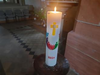 Die Osterkerze wurde an Ostern in der Katharinenkirche von der kath. Gemeinde als Zeichen der gemeinsamen Glaubensverbundenheit überbracht. Sie leuchtet nun in jedem Gottesdienst als Zeichen der österlichen Auferstehungsgewissheit und zum Gedenken für unsere heimgerufenen Gemeindemitglieder.