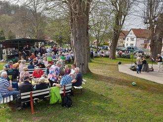 Von dort ging es über die Scherbdaer Höhe mit der herrlichen Aussicht vom Räuberturm hinab ins Werratal nach Ebenshausen. Unterwegs gab es manch Wissenswertes aus dieser Region und einige Überraschungen auf der kürzeren Strecke für Kinder. Auf dem Anger mit Spielplatz an der Werra erfreuten die Ebenshäuser die vielen Gäste mit selbstgebackenem Kuchen und Kulinarischem vom Grill. Instrumentalgruppen der Region unterhielten unter den blühenden Bäumen musikalisch. Den Abschluss bildete eine Abendandacht mit dem Chor Cantica Nova aus Ebenshausen in der Dreifaltigkeitskirche an der Werra. Gegen Abend standen Reisebusse bereit und brachten die Wanderer zum Ausgangspunkt zurück. Darin wurden noch fröhlich Volkslieder gesungen. Vielen Dank für zahlreiche Begegnungen und Gespräche, für die Gastfreundschaft der Kirchengemeinden Scherbda und Ebenshausen mit dem Kirchenkreis.