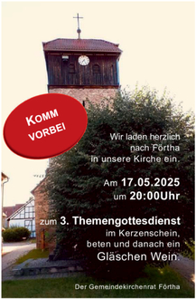 | 20.00 Uhr | Gottesdienst im Kerzenschein, beten und danach ein Gläschen Wein/ Kirche Förtha |
