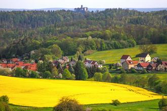 Vielerorts gelb umsäumt sind oder waren die Felder in Ende April und Anfang Mai - wie hier mit einem Blick von einer Anhöhe bei Wolfsburg-Unkeroda hinüber zur Wartburg.