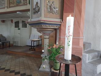 Die Osterkerze wurde an Ostern in der Katharinenkirche von der kath. Gemeinde als Zeichen der gemeinsamen Glaubensverbundenheit überbracht. Herr Andreas Günther aus Herda von der kath. Gemeinde gestaltete uns in diesem Jahr das Motiv der gemeinsamen Wurzel in Gott, unserem himmlischen Vater, seinem Sohn und dem Heiligen Geist in uns für die wunderbaren Blumen des Glaubens. Die Kerze leuchtet nun in jedem Gottesdienst als Zeichen der Verbundenheit in der österlichen Auferstehungsgewissheit und zum Gedenken für unsere heimgerufenen Gemeindemitglieder.