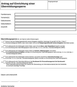 Die Meldebehörden führen gemäß § 2 Abs. 2 BMG zur Erfüllung ihrer Aufgaben Melderegister. Sie haben als betroffene Person das Recht, der Übermittlung Ihrer Daten zu widersprechen. Eine Übermittlungssperre kann beantragt werden für Datenübermittlungen
