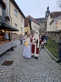 Eingesungen wurde der Weihnachtsmarkt von den Kindern des Kindergartens Regenbogen aus Geraberg und der Grundschule aus Geschwenda. Alle Kinder warteten schon sehnsüchtig auf den Weihnachtsmann, der dann auch in Begleitung seines Weihnachtsengels feierlich die Treppe heruntergeschritten kam. Ein sehr bewegender Moment. Die Kinderaugen strahlten. Und nicht nur diese, sondern auch die Erwachsenen freuten sich über seinen Besuch. Erinnerte es sie doch so ein wenig an ihre Kindheit. Weihnachtsmann und Engelchen bezogen ihr Weihnachtsbüro im Pfarrhof, wo man seine Geschenkewünsche in einen Postkasten stecken konnte, dem Weihnachtsmann ein Gedicht aufsagte und vom Engelchen ein Geschenk bekam. Im Kirchengemeindehaus konnte man gemütlich bei hausgebackenem Kuchen sitzen und sich dabei auch noch aufwärmen, denn es war ziemlich frostig an diesem Nachmittag.