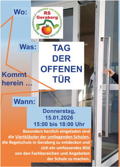 Am Donnerstag, den 15. Januar 2026, lädt die Staatliche Regelschule „Gerartal" Geraberg herzlich zum „Tag der offenen Tür" ein. Die Veranstaltung findet von 15:00 bis 18:00 Uhr in der Regelschule statt und bietet die Möglichkeit, die Regelschule kennenzulernen oder wiederzusehen.