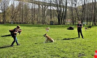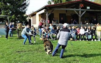 Gleich zu Beginn lernten die Kinder den Schäferhund „Cesar" kennen, der mit ihnen auf Schatzsuche ging und zielgenau die Fährte zur versteckten Schatzkiste aufnahm. Wie ein Polizeihund stellte „Cesar" danach einen Scheintäter und forderte die Kinder zum Tauziehen auf. Bei dem anschließenden Theorieteil lernten die Kinder Wissenswertes rund um den Hund, somit konnten dann alle mit Bravur das „Große Hundequiz" lösen. Die Wolfshundhündin „Nora" zeigte kleine Kunststücke, der Deutsche Schäferhund „Don" lief vorzüglich die Elemente einer Begleithundprüfung, der Bordercolli „Cooper" und die Collihündin „Berry" zeigten wie man als Herdenhund Schafe hütet.