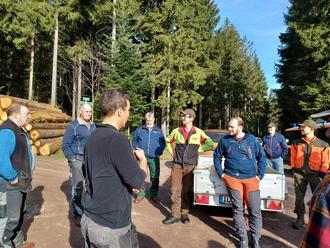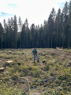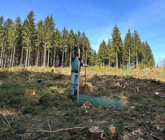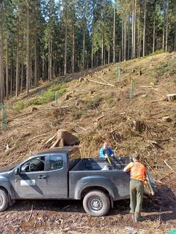 Dieser Sache geschuldet und um örtlich wirksam zu werden, trafen sich 8 Kameraden der DRK-Bergwacht Gräfenroda, 4 Helfer der Grawerederer Jongs sowie 4 Helfer vom ThüringenForst. Unter Anleitung von Revierförster Ramon Enke und Thüringer Forstwirten wurden im Waldgebiet Dicke Tanne/Kleine Hohe Warte/Revier Gräfenroda 100 Douglasien gepflanzt und mit Verbissschutz versehen. Diese Baumart soll im Rahmen Waldumbaus getestet werden.