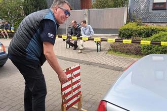 Die 121 Fahrzeuge, die ein Alter von 20 bis 30 Jahren hatten, mussten in Gräfenroda die Prüfung "Abstand hinten" durchführen. Dabei wurde ein Schild an die hintere Stoßstange gestellt und dann sollten die Fahrer 70 cm vorfahren.