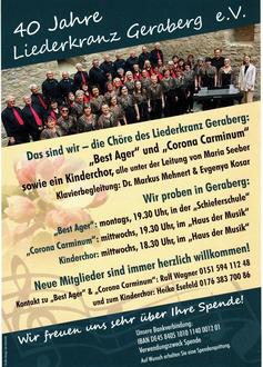 | Der Liederkranz Geraberg e.V. möchte Sie zu unserm Jubiläumskonzert am 21.09.2024 um 17:00 Uhr, zum unserm 40-jährigen Bestehens, einladen. |