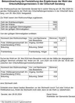 gendes Wahlergebnis der Wahl des Ortschaftsbürgermeisters in der Ortschaft Gera-