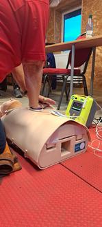 Im praktischen Teil hatten die Teilnehmer die Möglichkeit, das Gelernte unter Anleitung von Messing und Wolf anzuwenden. Mit Hilfe von Übungsgeräten wurden realitätsnahe Szenarien nachgestellt, bei denen die korrekte Handhabung und die Durchführung einer Reanimation trainiert wurden. Frauke Eschrich überwachte die Übungen und gab wertvolle Tipps zur Verbesserung der Technik und Effizienz.