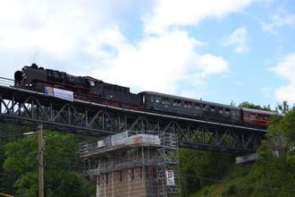 Der 11. August 2013 war, fast wie bestellt, ein strahlender Sommertag. Schon am Vormittag füllten sich die Parkplätze in und um das Dorf. Mit den Festansprachen und dem Lob an die Bauleiter und Bauarbeiter wurde auch die Geduld der Einwohner und Fahrgäste gewürdigt. Altbürgermeister Udo Lämmer rückte in seiner Laudatio wieder einmal Angelroda in den Mittelpunkt Europas. Dann kam sie, die Dampflok des Werkes Meiningen mit dem Sonderzug ganz langsam über die neue Brücke, mit ständigem Pfeifen, begleitet von Hurra und freudigen Klatschen der Menschenmenge. Nun überwältigten mich doch die Emotionen. Sie ist erhalten geblieben, „meine“ Angelrodaer Brücke, nicht durch einen sterilen Neubau ersetzt. Seit meinem ersten Besuch als Kind mit meinem Opa hat sie mich nicht wieder losgelassen.