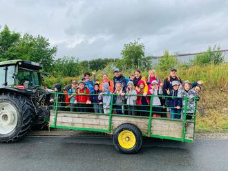Die Klasse 2b der Grundschule „An der Burglehne“ Gräfenroda nutze den Wandertag am 05.07.2023, um sich von Klasse 2 zu verabschieden. Alle Kinder wanderten zum Bahnhof Dörrberg und fuhren mit der STB bis nach Plaue. Von Plaue ging es weiter zu Fuß Richtung Rippersroda. Doch was wartete da hinter der Abzweigung an der Hauptstraße nach Rippersroda? Cool ein Traktor mit Anhänger!