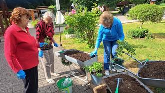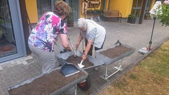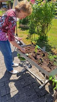 Viel Einsatz und Freude legten die Besucherinnen der Tagespflege bei der Gestaltung an den Tag. Einige können nun endlich ihrem Hobby, der Gärtnerei, wieder nachgehen. Die angepflanzten Kräuter und Gemüsepflanzen sollen in Zukunft natürlich mit in der hauseigenen Küche verwendet werden.