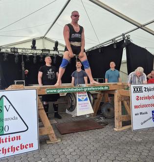 1991 stand ein Sportfest an und weil das nicht nur vom Fußball dominiert werden sollte, erfanden die Gewichtheber einen neuen Wettbewerb. „Das Steinheben kam sehr gut an, und so gab es nicht nur 1992 eine Neuauflage, sondern wir organisieren das Fest seither mit ein paar Unterbrechungen jedes Jahr.“ 2011 führte die Brandstiftung der überdachten Bühne in der Alten Lache zur Absage, dann Corona gleich für drei Jahre in Folge zwischen 2020 und 2022. Doch totzukriegen ist die Veranstaltung nicht, ganz im Gegenteil. „Das Steinheben gehört inzwischen ganz fest zu Gräfenroda und das soll auch so bleiben“, so Geratals Bürgermeister Dominik Straube, der 43-Jährige sogar selbst zur Hantel griff und obwohl er felsenfest behauptete, dafür gar nicht trainiert zu haben, zog er 221 Kilogramm nach oben. Das Ganze mit dem alten Originalstein, der durch eine später angebrachte Aufhängung für zusätzliche Scheiben inzwischen 201 Kilogramm wiegt.