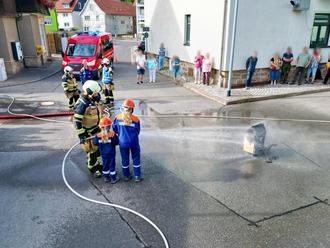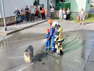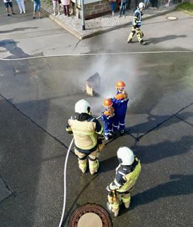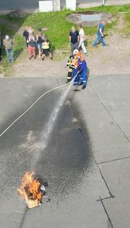 Im Rahmen der Vorführung wurde ein brennendes Haus simuliert. Mit großem Eifer und beeindruckender Professionalität gingen die Kinder ans Werk, um den Brand zu löschen und die Situation unter Kontrolle zu bringen.