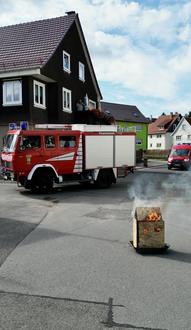 Die Ankunft der Feuerwehrfahrzeuge wurde von den Zuschauern mit Spannung erwartet. Die jungen Feuerwehrleute sprangen aus den Fahrzeugen und bereiteten die Löscharbeiten vor.